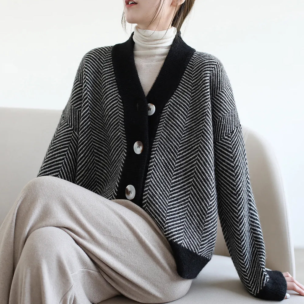 Autumn Women Stripe Lazy Loose Color Blocking V Neck Temperament Knitted Cardigan Coat