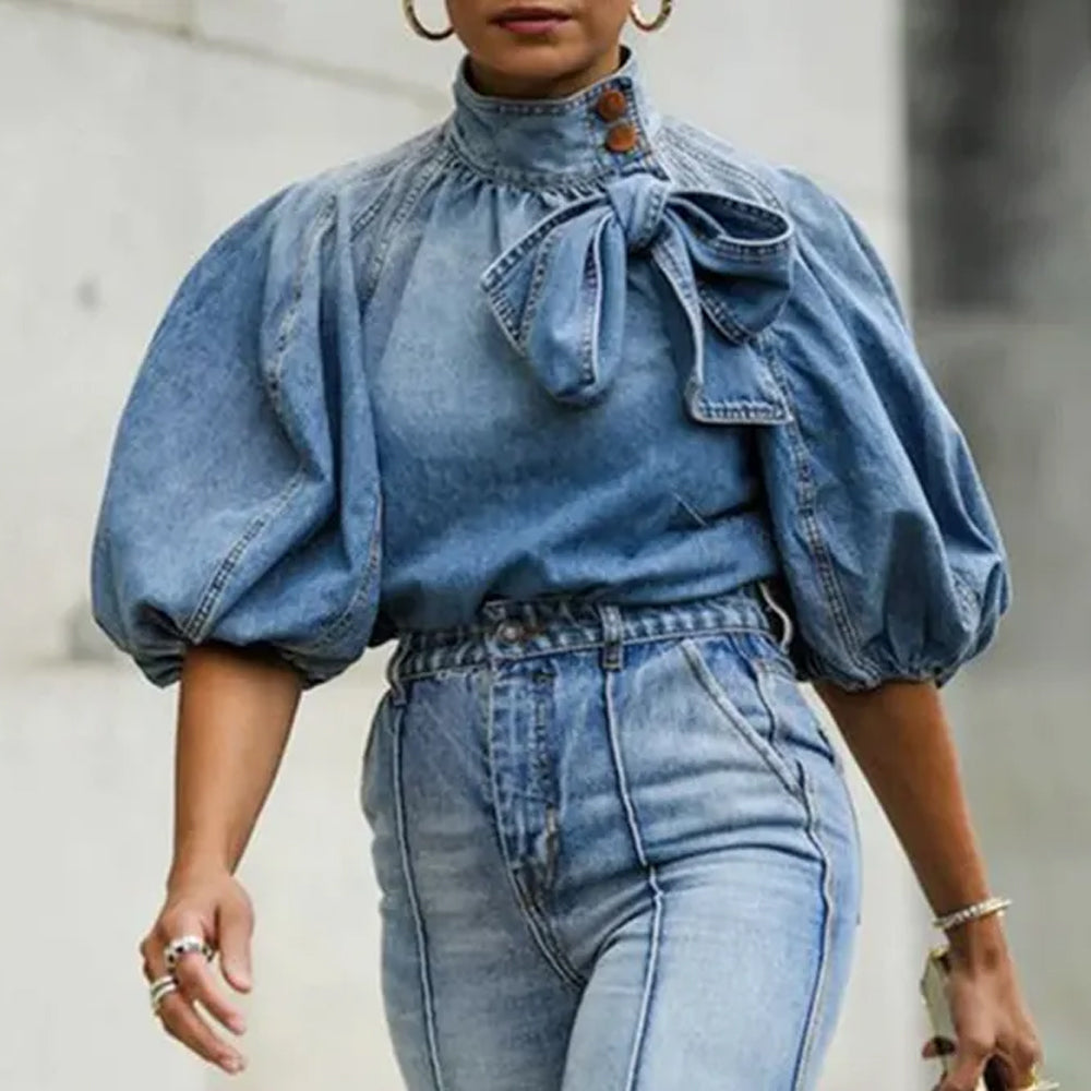Women's Loose Puff Sleeve Round Neck Pullover Denim Jacket