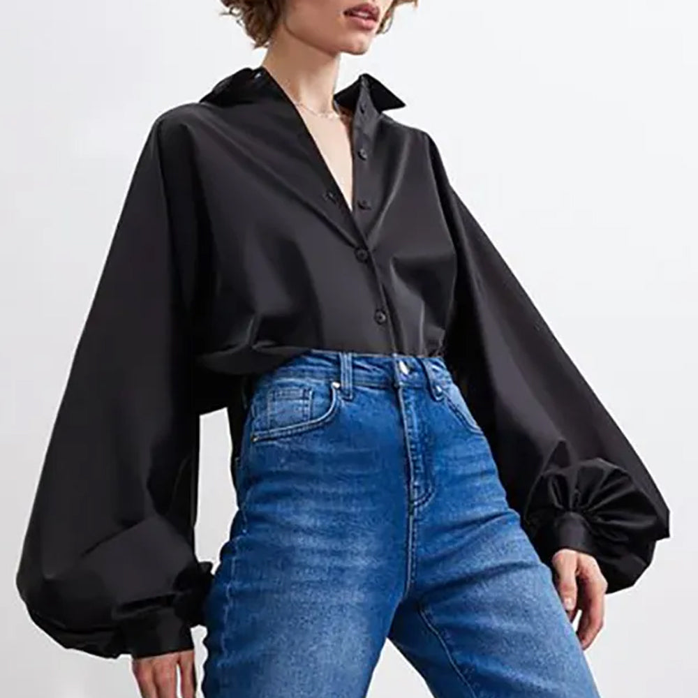 Women's Fashion Elegant Solid Color Lapel Single-Breasted Lantern Sleeve Blouse