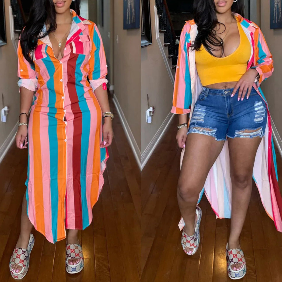 Women Casual Multicolor Stripe Print Button Pocket Dress Long Blouse