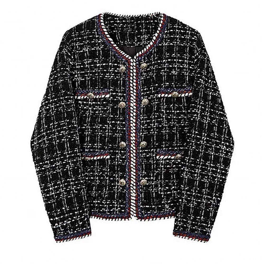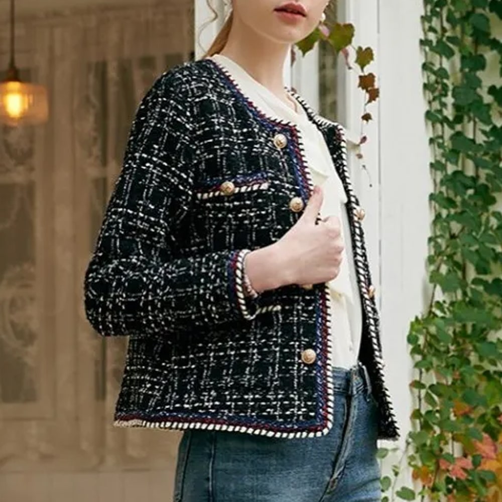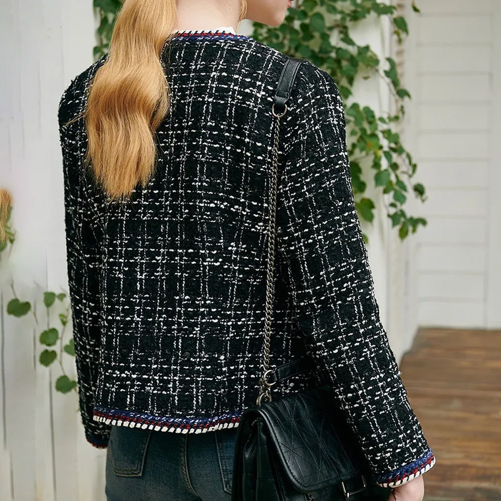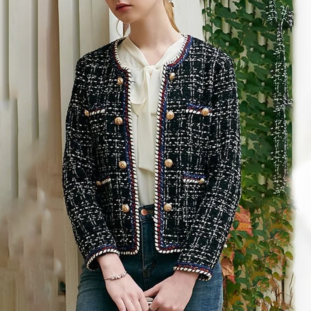 Women Chic Elegant Collarless Long Sleeve Tweed Blazer Coat